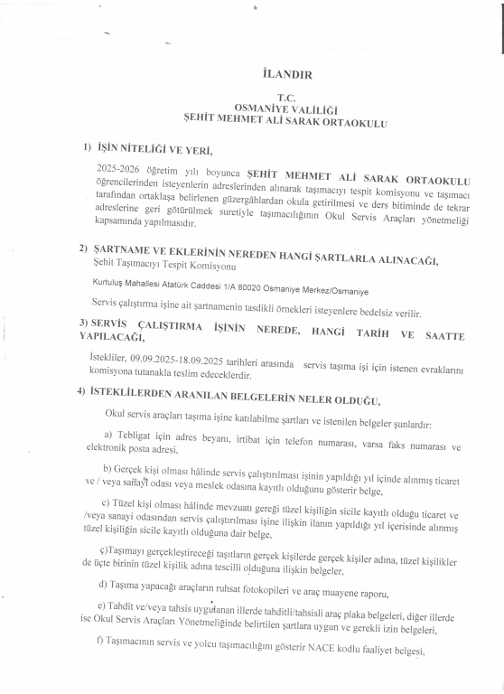2025 -2026 EĞİTİM ÖĞRETİM YILI ŞEHİT MEHMET ALİ SARAK ORTAOKULU SERVİS ÇALIŞTIRMA İLANI